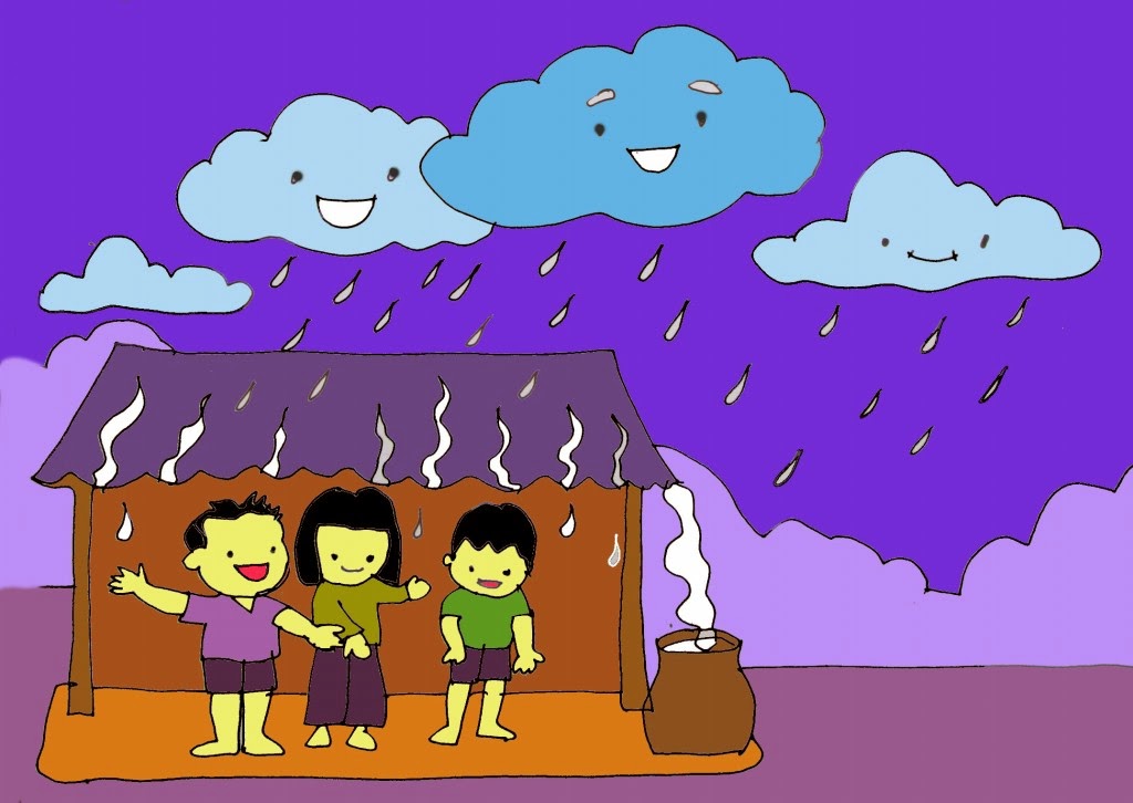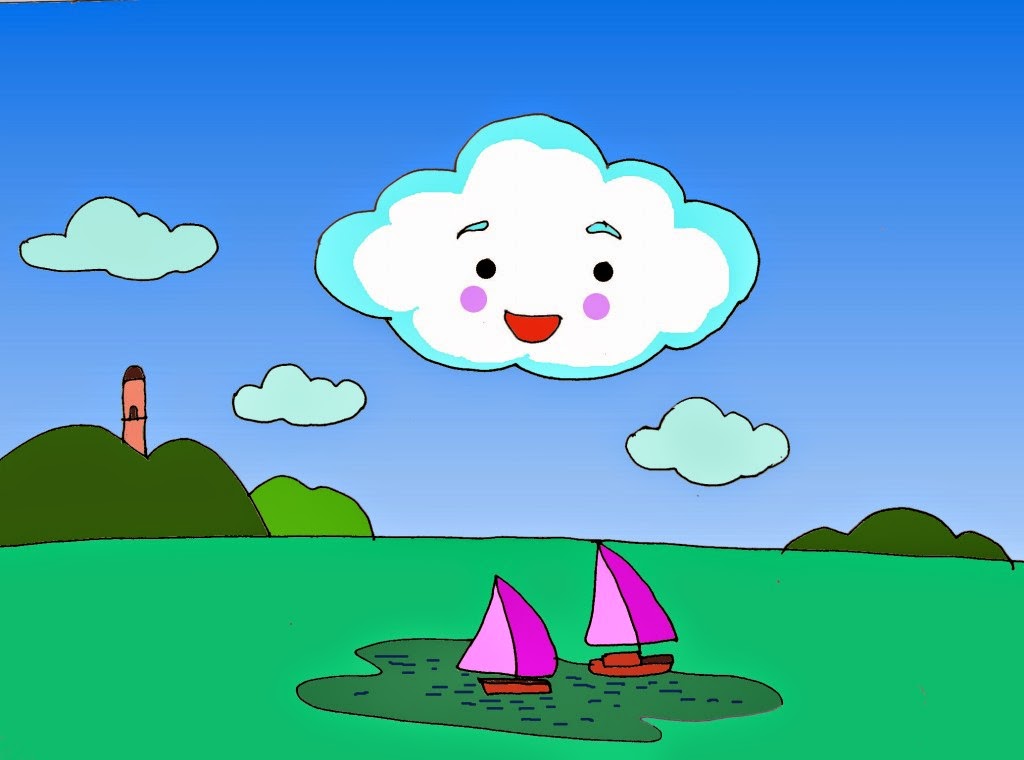 Thế là cô Mây trên trời cao đã hóa thành dòng nước chảy tràn khắp ao hồ, đồng ruộng, sông ngòi.