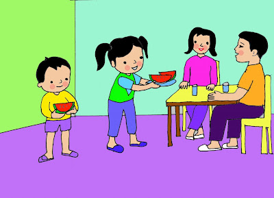 Giờ ăn phụ cô chia thìa, bưng cơm.